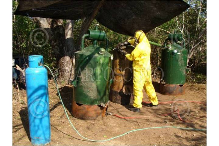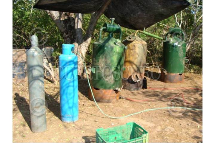 BUENAVISTA, MICHOACAN, 06NOVEIMBRE2009.- Elementos del Ejercito al efectuar reconocimientos terrestres a inmediaciones del poblado División del Norte, municipio de Buenavista, localizaron un laboratorio clandestino para el procesamiento de droga sintética, donde aseguraron diverso material de laboratorio, destacando tres reactores con 300 litros de sustancias químicas y una camioneta marca Mitsubishi. Durante este evento no hubo detenidos y lo asegurado fue puesto a disposición de las autoridades correspondientes. FOTO: CUARTOSCURO.COM