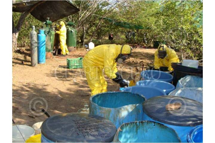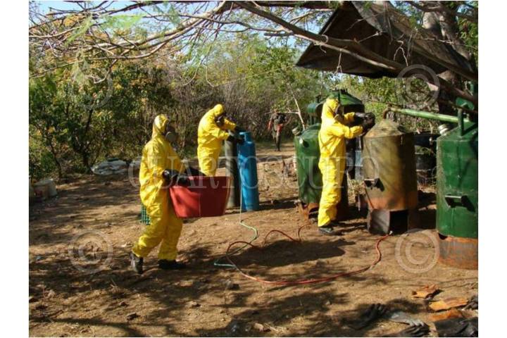 TAMAZULA, DURANGO, 07AGOSTO2009.- Elementos del ejercito mexicano encontraron un narcolaboratorio donde se fabricaban droga del tipo ice y cristal ubicado en 240 hectáreas de terreno en la comunidad Las Trancas, perteneciente a este muncipio. En el lugar se encontraron ambas drogas, 164 tambos de 200 litros cada uno, con capacidad para almacenar 32,800 litros de productos químicos, así como 18 vehículos, entre ellos un cargador frontal y varias cuatrimotos, y tambien vestuario tipo militar. Dentro del complejo se encontraron 22 instalaciones diversas para el procesamiento de drogas sintéticas y empaquetamiento de mariguana, las cuales comprenden dormitorios, cocinas, casas de descanso, bodegas para almacenaje y laboratorios, incluyendo una cabaña de lujo para el Jefe del Complejo. FOTO: SEDENA/CUARTOSCURO.COM
