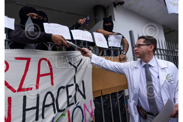 TOLUCA, ESTADO DE MÉXICO, 06JUNIO205.- Hugo Mendieta, director de la Facultad de Medicina entregó un documento a estudiantes paristas, mientras otros estudiantes, padres de familia y profesores de la Facultad de Medicina de la Universidad Autónoma del Estado de México se reunieron en las inmediaciones de esta institución para expresar su rechazo al paro que se mantiene en la escuela, con pancartas expresaron su deseo de regresar a sus actividades. FOTO: CRISANTA ESPINOSA AGUILAR /CUARTOSCURO.COM