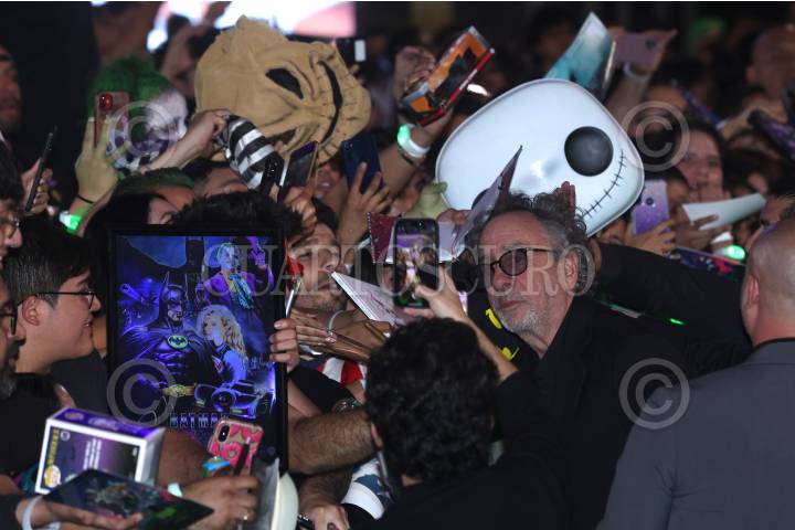 NAUCALPAN, ESTADO DE MÉXICO, 14AGOSTO2024. El director Tim Burton se toma fotos y da autógrafos a fans durante el Fan Event y alfombra blanco y negro de la película “Beetlejuice, Beetlejuice”, en su gira de promoción mundial, previo a su estreno en cines. FOTO: EDGAR NEGRETE LIRA/CUARTOSCURO.COM