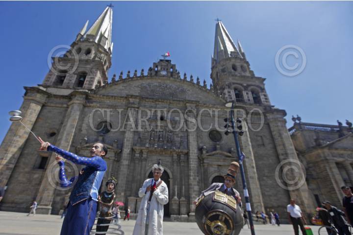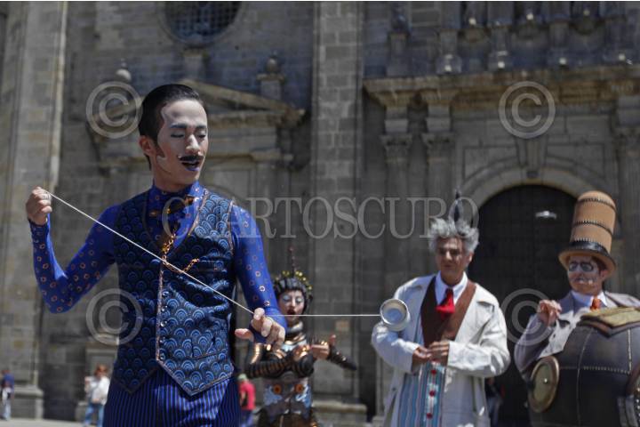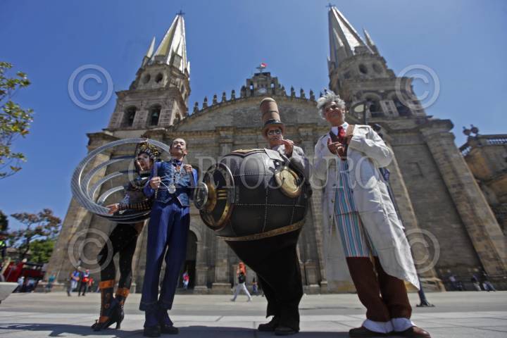 GUADALAJARA, JALISCO. 03OCTUBRE2024.- Personajes de Kurios - Gabinete de Curiosidades, espectáculo del Circo DU Solei, salen a las calles del centro de Guadalajara como parte de la promoción del show. FOTO: FERNANDO CARRANZA GARCIA / CUARTOSCURO.COM