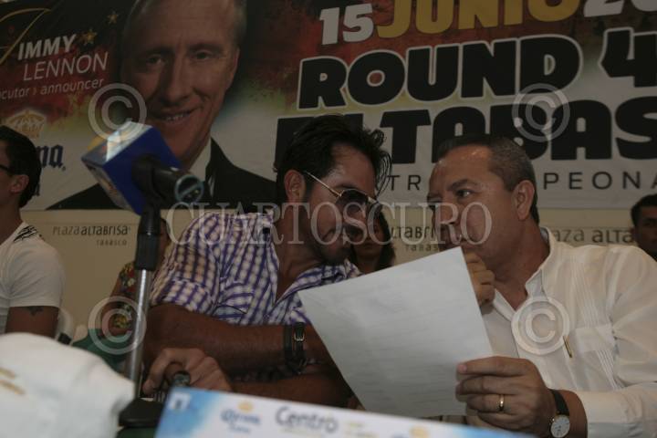 VILLAHERMOSA, TABASCO, 27MAYO2013.- José Pepe Gómez, promotor de Cancún Boxing en compañía de Mauricio Sulaimán, secretario ejecutivo del Consejo Mundial de Boxeo, dieron a conocer de la gala boxistica denominada "Round 4.4.9" que se desarrollara el próximo 05 de Junio en la capital tabasqueña. Ahí también dijeron en presencia como invitado de honor a Humberto de los Santos Bertruy, alcalde centro, que dicha función avalada por el CMB tendrá cuatro peleas de campeonato. FOTO: MARCO POLO GUZMÁN HERNÁNDEZ / CUARTOSCURO.COM