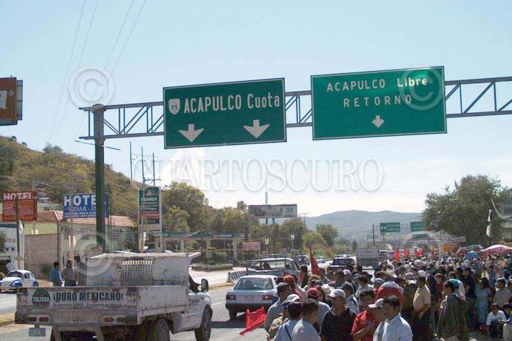 CHILPANCINGO, GUERRERO, 16NOVIEMBRE2004.-Campesinos, maestros y estudiantes que intengran la Promotora Estatal Contra el Neoliberalismo durante un plantón sobre la autopista del sol a la altura de la ciudad de Chilpancingo; justo al frente del lugar donde se desarrollaban las mesas de negociación con sus líderes para exigir se cumpla lo prometido por el gobernador René Juárez. FOTO: Oscar Alvarado/CUARTOSCURO.COM