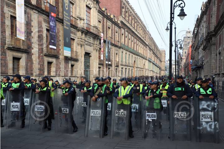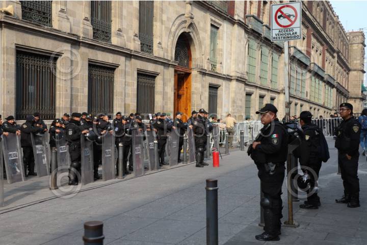 CIUDAD DE MÉXICO, 22MAYO2025.- Elementos de la policía capitalina custodian el acceso a Palacio Nacional luego de que el día de ayer los maestros de la CNTE impidieron el paso de la prensa y funcionarios a la conferencia matutina. FOTO: DANIEL AUGUSTO/ CUARTOSCURO.COM