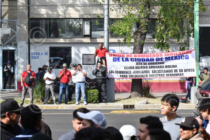 CIUDAD DE MÉXICO, 06DICIEMBRE2024.- Bomberos jubilados se manifestaron durante la presentación por parte de autoridades capitalinas, del protocolo contra incendios en la Estación de Bomberos Benito Juárez. FOTO: MARIO JASSO CUARTOSCURO.COM