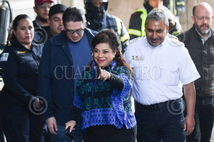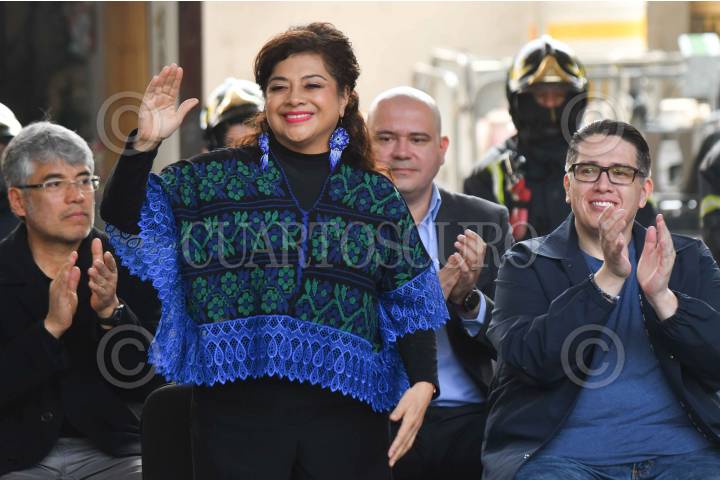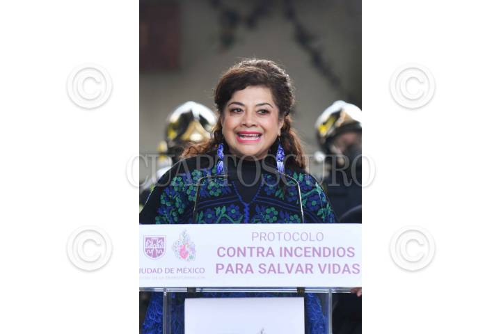 CIUDAD DE MÉXICO, 06DICIEMBRE2024.- Clara Brugada, jefa de Gobierno, durante la presentación del protocolo contra incendios, en la Estación de Bomberos Benito Juárez. El protocolo consiste en una revisión domiciliaria en instalaciones de gas y electricidad por parte del Heroico Cuerpo de Bomberos y Protección Civil, para evitar incendios durante la temporada decembrina. FOTO: MARIO JASSO CUARTOSCURO.COM