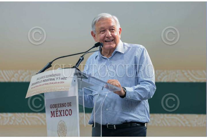 SAN LUIS POTOSÍ, SAN LUIS POTOSÍ, 20JULIO2024.- Andrés Manuel López Obrador, presidente de México, durante su participación en el acto protocolario "Balance económico: desarrollo industrial y T-MEC" en el en Centro de Convenciones de San Luis Potosí. FOTO: PRESIDENCIA/CUARTOSCURO.COM