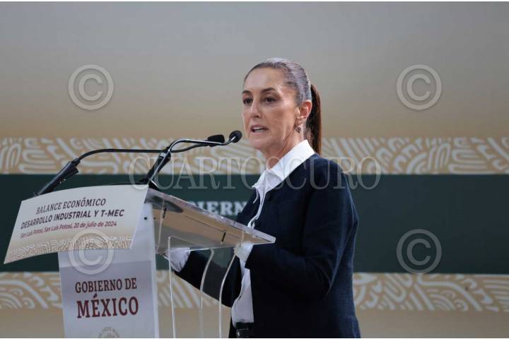 SAN LUIS POTOSÍ, SAN LUIS POTOSÍ, 20JULIO2024.- Claudia Sheinbaum Pardo, virtual presidenta electa de México, durante su intervención en el acto protocolario "Balance económico: desarrollo industrial y T-MEC" en el en Centro de Convenciones de San Luis Potosí. FOTO: PRESIDENCIA/CUARTOSCURO.COM