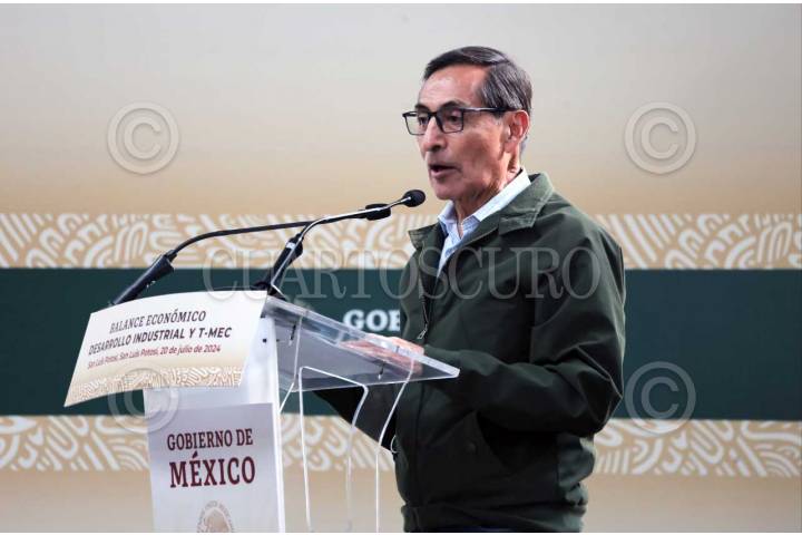 SAN LUIS POTOSÍ, SAN LUIS POTOSÍ, 20JULIO2024.- Rogelio Ramírez de la O, secretario de Hacienda y Crédito Público, durante su intervención en el acto protocolario "Balance económico: desarrollo industrial y T-MEC" en el en Centro de Convenciones de San Luis Potosí. FOTO: PRESIDENCIA/CUARTOSCURO.COM
