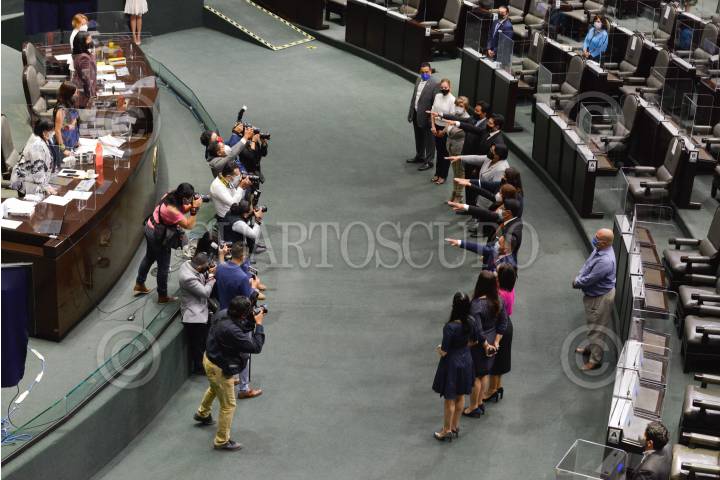 Integrantes del grupo parlamentario del PAN se toman una fotografía durante la sesión ordinaria de la Cámara de Diputados, en donde se prevé de por terminado el periodo de sesiones durante transcurso de la noche.