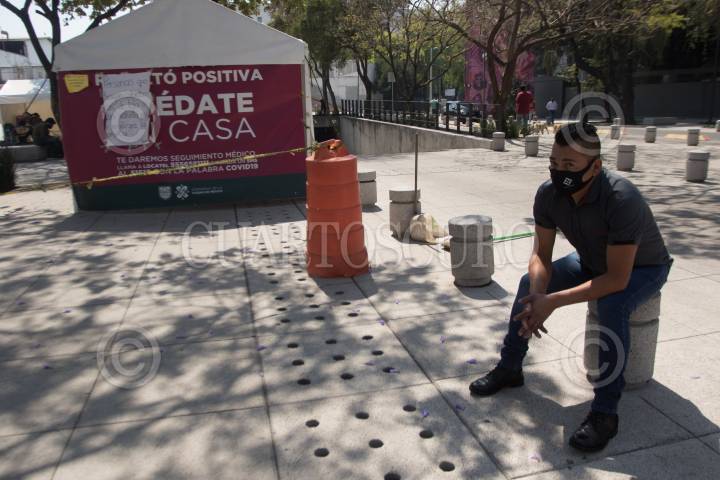 Mega Kiosko Covid 19, en la plaza de Tlaxcoaque, en el centro histórico de la Capital.