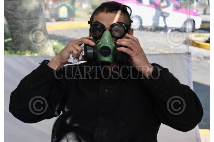 Con goggles y mascarilla hombre espera su turno para la toma de muestra en el Kiosco de la Salud. FOTO: ROGELIO MORALES /CUARTOSCURO.COM