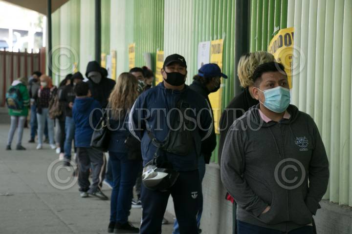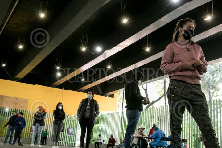 Personas esperan la aplicación de pruebas rápidas Covid-19 en el Macro Kiosco de Tacuba, Miguel Hidalgo.