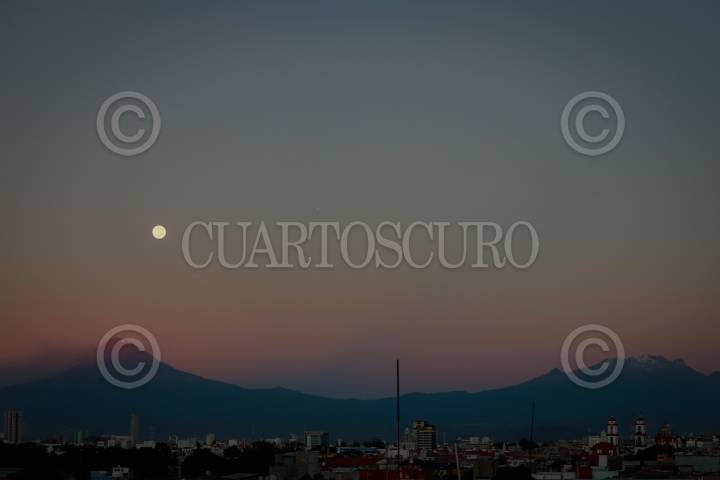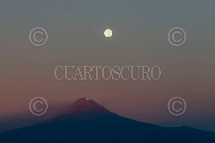 Vista de la primera luna llena de octubre y el volcán popocatépetl al amanecer.
