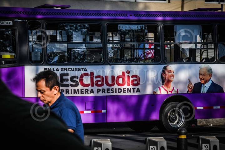 Propaganda política en un autobús de transporte público en favor de Claudia Sheinbaum, aspirante a coordinadora del lado comités de defensa de la Cuarta Transformación" para el proceso electoral de 2024, junto a la imagen de Andrés Manuel López Obrador, presidente de México.