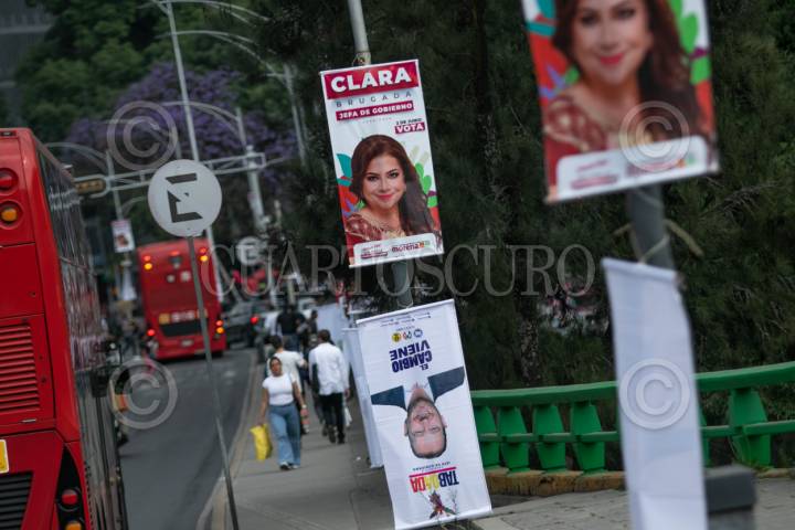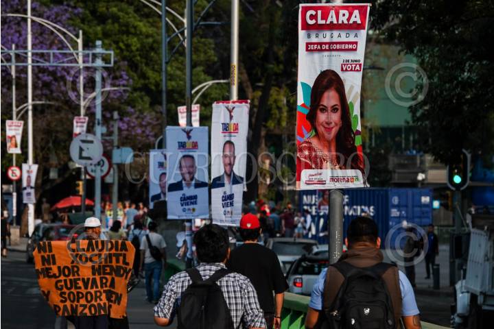 CIUDAD DE MÉXICO, 12MARZO2024.- Decenas de pancartas con los rostros del candidato a jefatura de gobierno de la Ciudad de México por la coalición PAN-PRI-PRD, Santiago Taboada, y Clara Brugada, candidata de la alianza Morena-PVEM-PT, han inundado Paseo de la Reforma durante este tiempo de campañas electorales. FOTO: GALO CAÑAS/CUARTOSCURO.COM