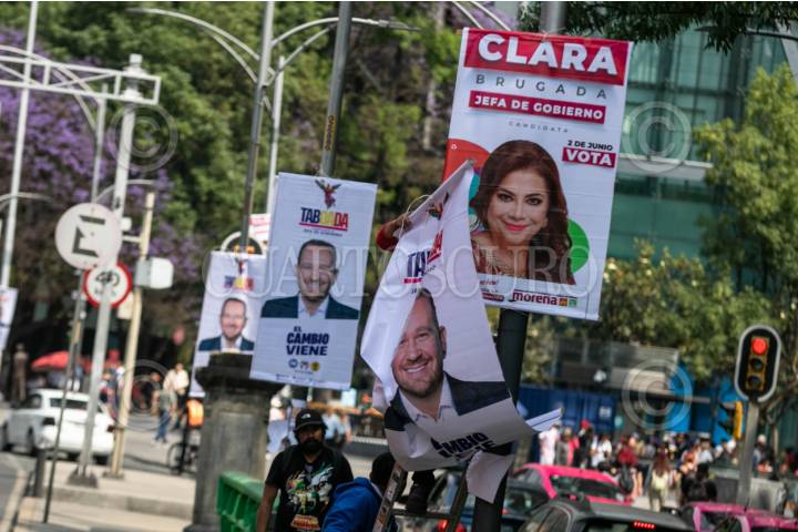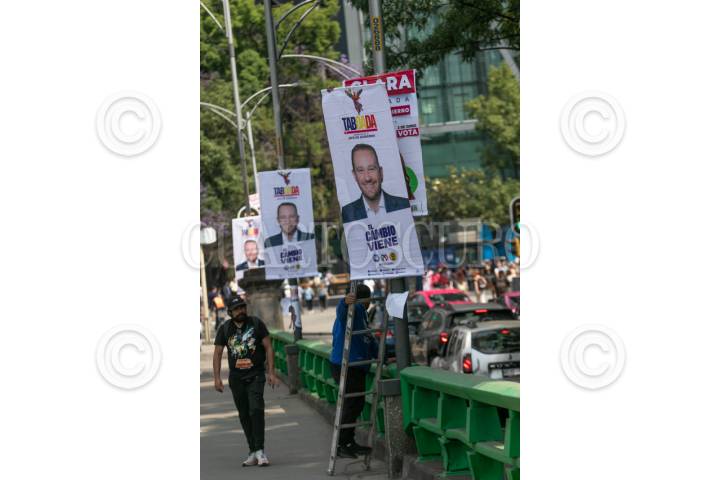 CIUDAD DE MÉXICO, 12MARZO2024.- Inició la guerra por los espacios públicos para que los candidatos a la Jefatura de Gobierno se publiciten hacia la sociedad. En avenida Reforma se han colocado una gran cantidad de pendones publicitarios mostrando la imagen de Clara Brugada (Morena) y Santiago Taboada (PAN). Una brigada de simpatizantes del panista se dedicó a colocar estos cárteles sobre la publicidad de la morenista. FOTO: MOISÉS PABLO/CUARTOSCURO.COM