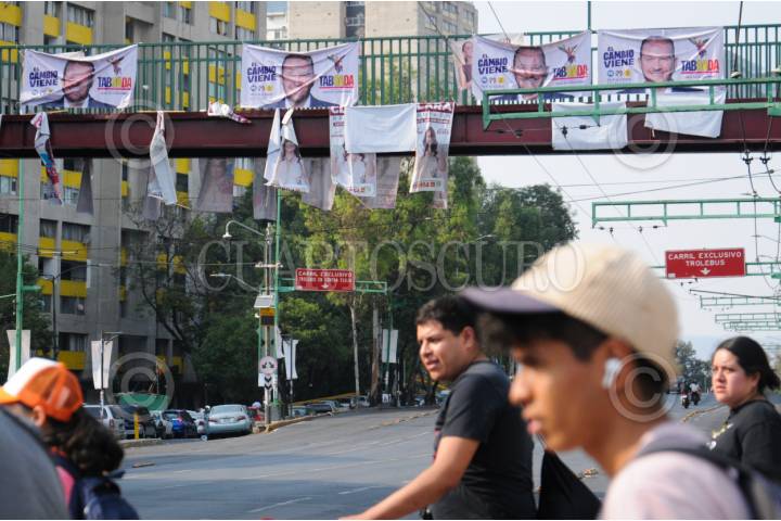CIUDAD DE MÉXICO, 07ABRIL2024.- Propaganda electoral cuelga de unos de lo puentes peatonales de Eje Central, en el centro de la capital. FOTO: DANIEL AUGUSTO / CUARTOSCURO.COM
