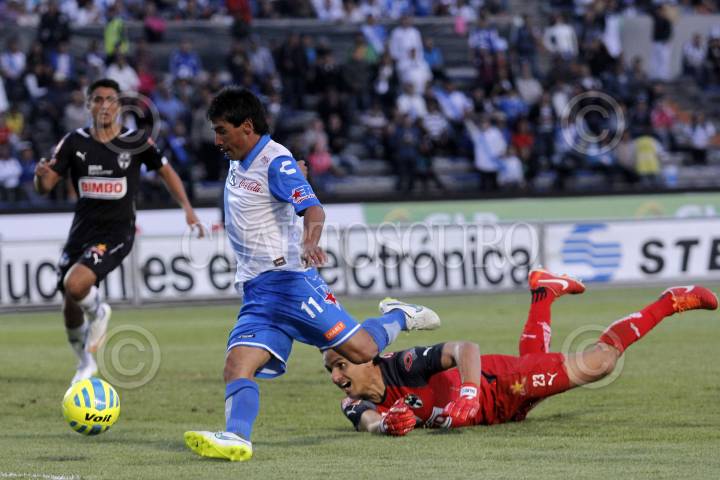 PUEBLA, PUEBLA., 14FEBRERO2015.- Matías Alustiza rinde al portero Juan Ibarra del Monterrey en jugada del partido entre el Puebla de la Franja y los Rayados del Monterrey en partido correspondiente a la jornada 6 de la liga MX celebrado en el estadio universitario de la BUAP. FOTO: HILDA RÍOS/ CUARTOSCURO.COM