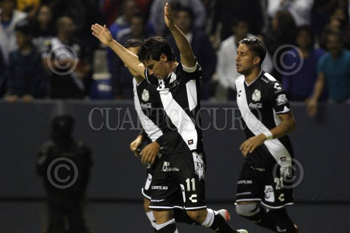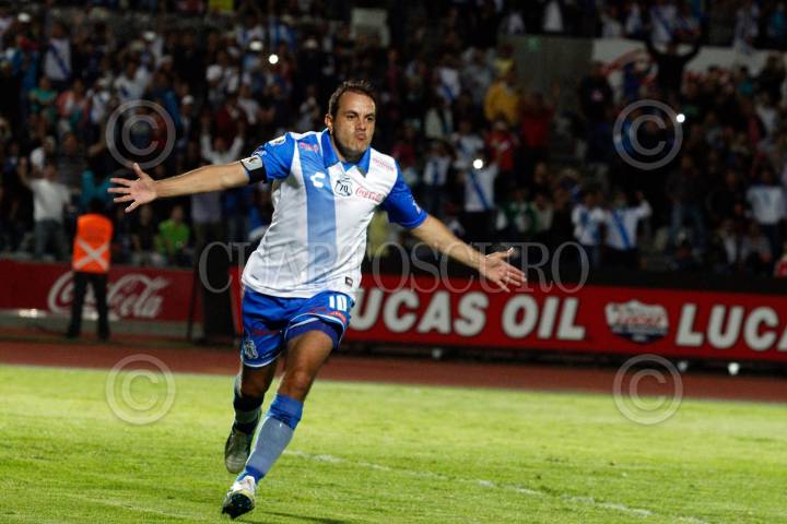 PUEBLA, PUEBLA, 24ABRIL2016.- El jugador Matias Alustiza festeja durante el partido entre el Puebla de la Franja y los jaguares de Chiapas que culminó con marcador 2-1 a favor del equipo local, en partido correspondiente a la jornada 15 del torneo de Clausura 2016 de la Liga BBVA Bancomer MX disputado en el estadio Cuauhtémoc. FOTO: HILDA RÍOS / CUARTOSCURO.COM