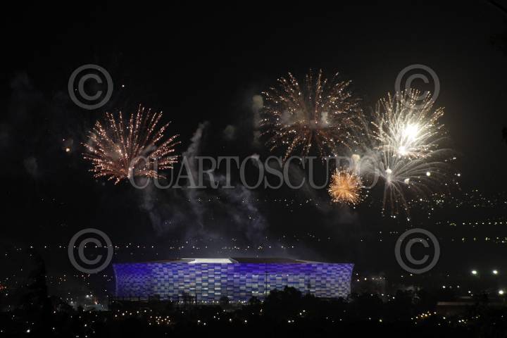 PUEBLA, PUEBLA,19NOVIEMBRE2015.- Pirotecnia durante el juego entre el Puebla de la Franja y el Boca Juniors de Argentina en partido celebrado ayer con motivo de la reinauguración del estadio Cuauhtémoc. FOTO: HILDA RÍOS /CUARTOSCURO.COM