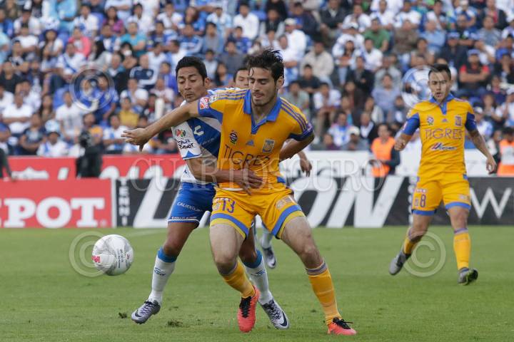 PUEBLA, PUEBLA, 20MARZO2016.- Los jugadores Alberto Acosta y José Rivas, durante jugada del partido entre el Puebla de la Franja y los Tigres de la UANL empatado a cero goles, correspondiente a la jornada 11 del torneo de clausura 2016 de la Liga BBVA Bancomer MX, disputado en el estadio Cuauhtémoc. FOTO: HILDA RÍOS /CUARTOSCURO.COM