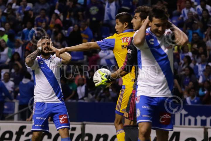 PUEBLA, PUEBLA, 20MARZO2016.- Los jugadores Eduardo Péres y Nahuel Guzmán, durante jugada del partido entre el Puebla de la Franja y los Tigres de la UANL empatado a cero goles, correspondiente a la jornada 11 del torneo de clausura 2016 de la Liga BBVA Bancomer MX, disputado en el estadio Cuauhtémoc. FOTO: HILDA RÍOS /CUARTOSCURO.COM