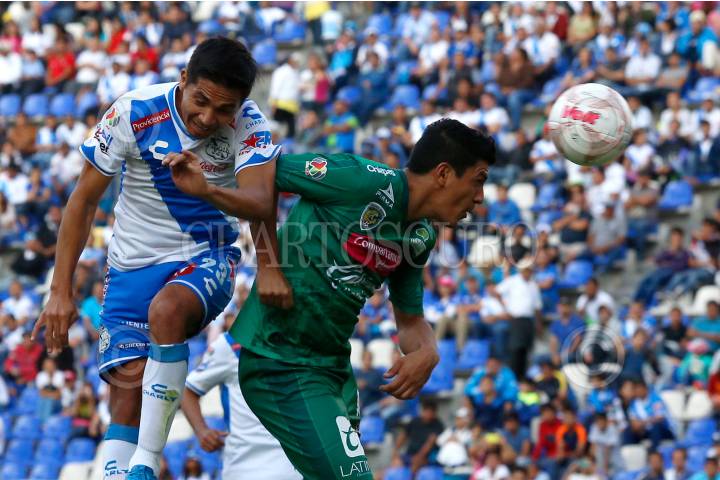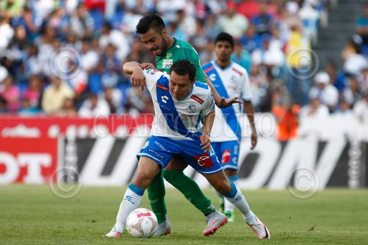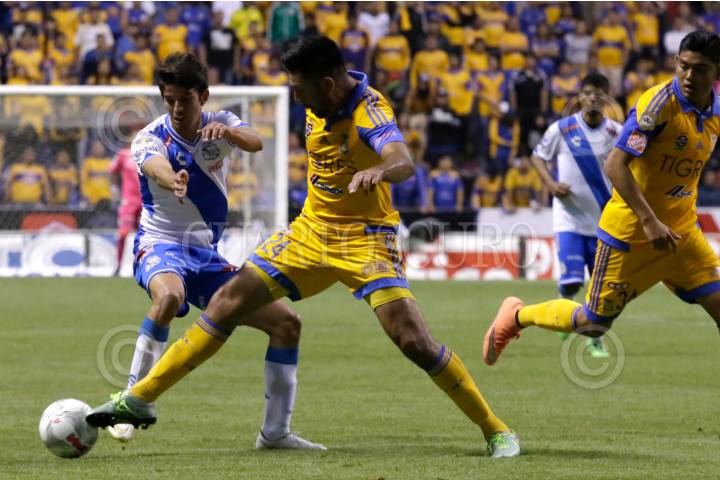 PUEBLA, PUEBLA, 20MARZO2016.- Los jugadores José Toledo y José Torres durante jugada del partido entre el Puebla de la Franja y los Tigres de la UANL, correspondiente a la jornada 11 del torneo de clausura 2016 de la Liga BBVA Bancomer MX, disputado en el estadio Cuauhtémoc. FOTO: HILDA RÍOS /CUARTOSCURO.COM