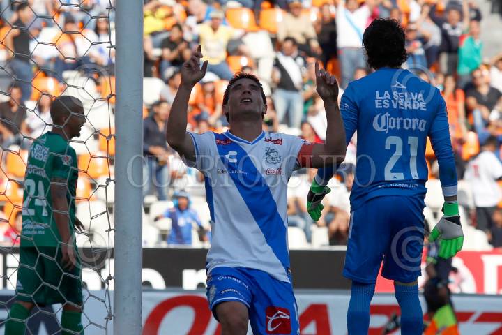 PUEBLA, PUEBLA, 24ABRIL2016.- El jugador Eduardo Pérez festejó durante el partido entre el Puebla de la Franja y los jaguares de Chiapas que culminó con marcador 2-1 a favor del equipo local, en partido correspondiente a la jornada 15 del torneo de Clausura 2016 de la Liga BBVA Bancomer MX disputado en el estadio Cuauhtémoc. FOTO: HILDA RÍOS / CUARTOSCURO.COM