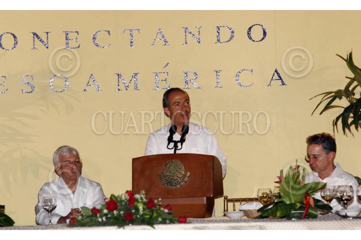 CAMPECHE, CAMPECHE, 10ABRIL2007.- Felipe Calderón Hinojosa, Presidente de los Estados Unidos Mexicanos, durante una reunión con los presidente del Salvador, Antonio Elías Saca, Guatemala, Oscar Berger Perdomo y Honduras, Manuel Zelaya Rosales en el marco de la cumbre de mandatarios del Plan Puebla-Panama. FOTO: ARIEL GUTIERREZ/CUARTOSCURO.COM