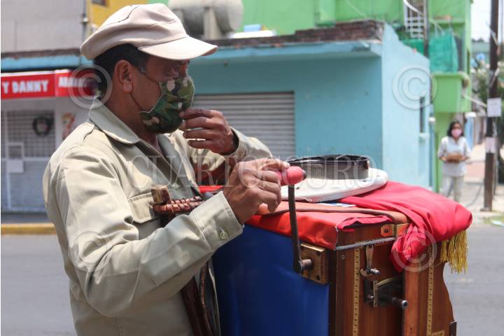 Un organillero toca melodías para ganarse unas monedas en la calle de Puente Titla