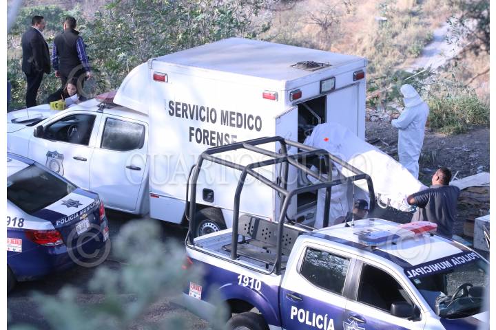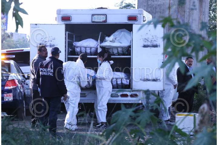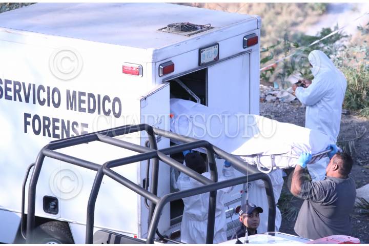 Trabajadores del SEMEFO levantan un cadáver en un sitio donde fueron localizados tres hombres estrangulados.