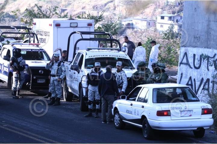 Elementos de la Guardia Nacional y del Ejercito colaboran en el acordonamiento de una escena de crimen donde fueron localizados tres cadáveres de hombres, al sur de la capital de Morelos.