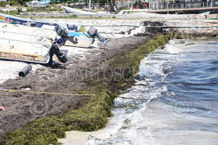 En playas de Puerto Juárez, Cancún, ya se reporta el arribo de sargazo, cuando habitualmente el arribo de esta macroalga es en el mes de mayo.