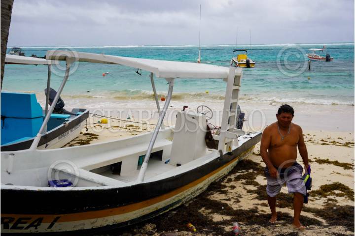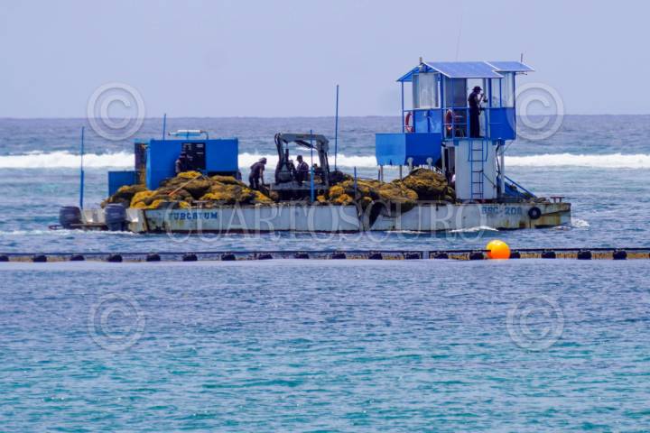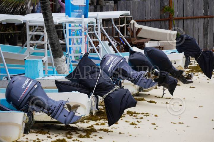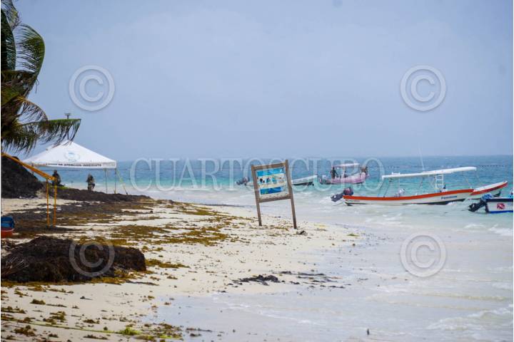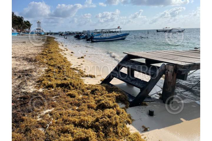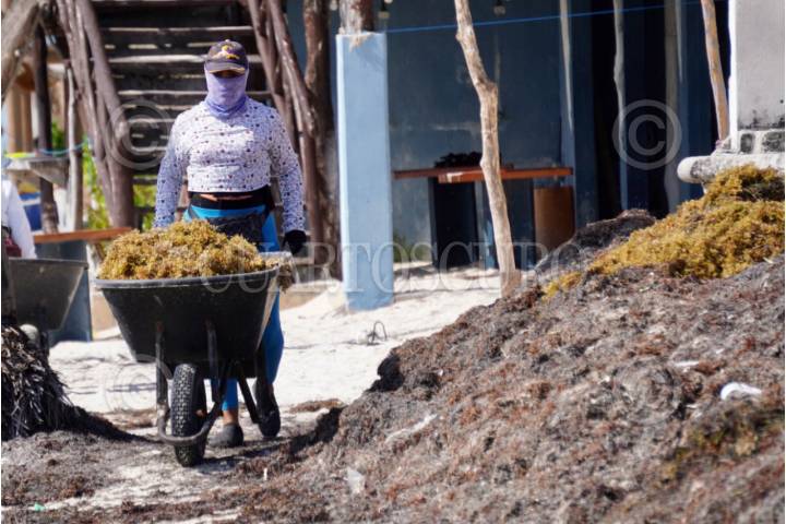 PUERTO MORELOS, QUINTANA ROO, 07MARZO2024.- Según la Universidad del Sur de Florida, habrá un aumento en la abundancia y distribución del sargazo en Quintana Roo en los primeros meses de 2024, pero la extensión a largo plazo de la floración es incierta. Es importante señalar que el sargazo aumenta de abril a mayo. Aunque la llegada del alga es intermitente porque depende de diversas condiciones climáticas, si es moderada, los equipos de limpieza pronto la tendrán bajo control. Científicamente hablando, el sargazo es una macroalga planctónica de color marrón. Hay varias especies, pero la variedad de la que hablamos se caracteriza por tener vesículas llenas de gas que permanecen flotantes. FOTO: ELIZABETH RUIZ/CUARTOSCURO.COM