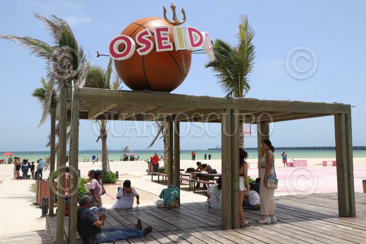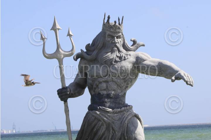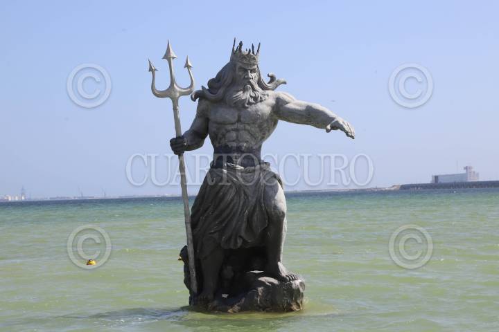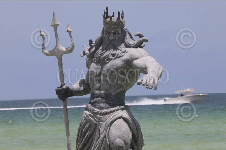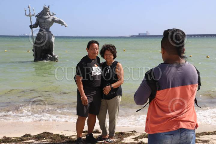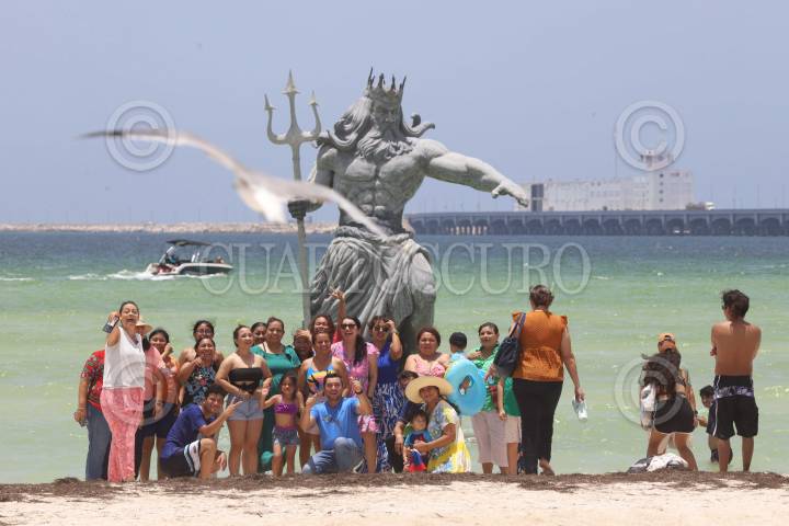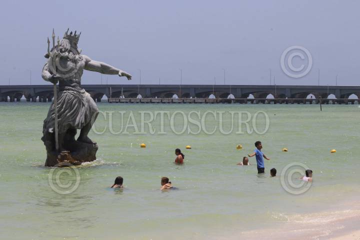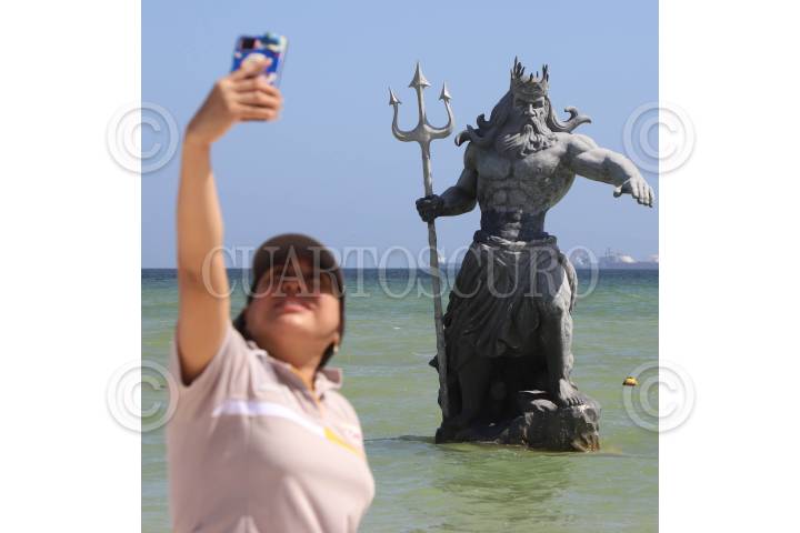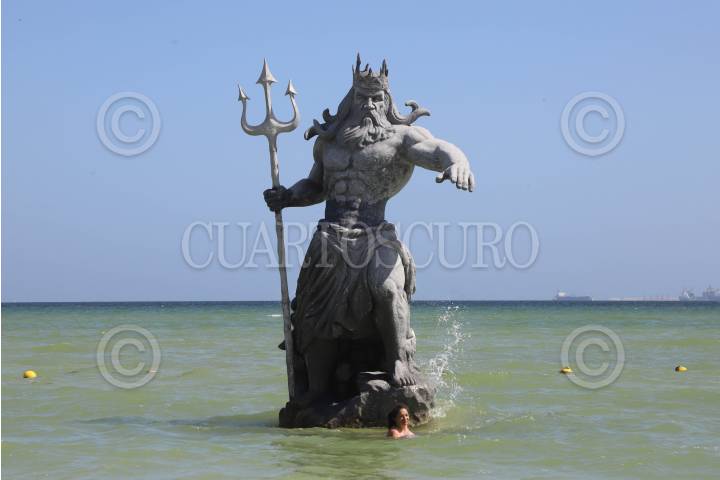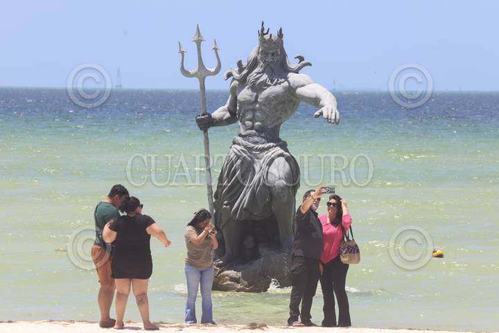 PROGRESO, YUCATÁN, 12JULIO2024.- Turistas nacionales y locales visitan la polémica estatua de Poseidón instalada por el Ayuntamiento de Progreso como destino o parador turístico, en dónde los visitantes pueden tomarse fotografías y nadar a su alrededor. La tarde de este jueves 11 de julio, personal de la dependencia federal de la PROFEPA arribo a este lugar para solicitar los documentos que acreditan el estudio de impacto ambiental, al no contar con estos decidieron clausurar de manera temporal la estatua mientras la Oficina de Representación de Protección Ambiental en Yucatán continue con el procedimiento administrativo, para determinar las acciones procedentes. Llamó la atención que en lugar no fueron colocados sellos de clausura y solamente se encuentran dos elementos de la policía ecológica municipal. FOTO: MARTÍN ZETINA/CUARTOSCURO.COM