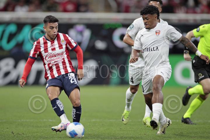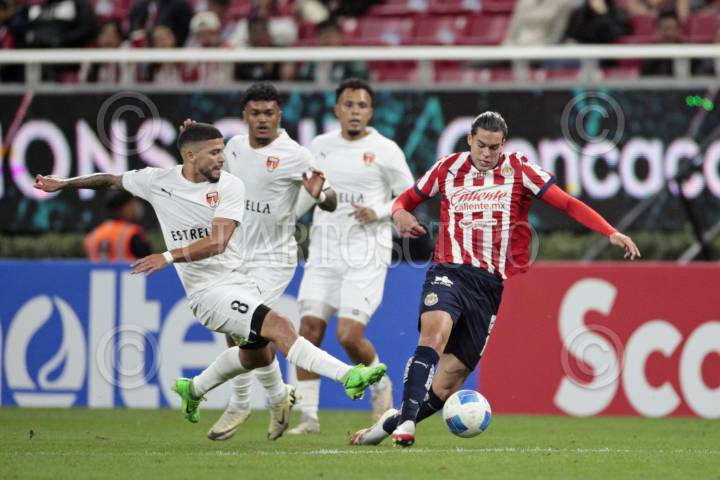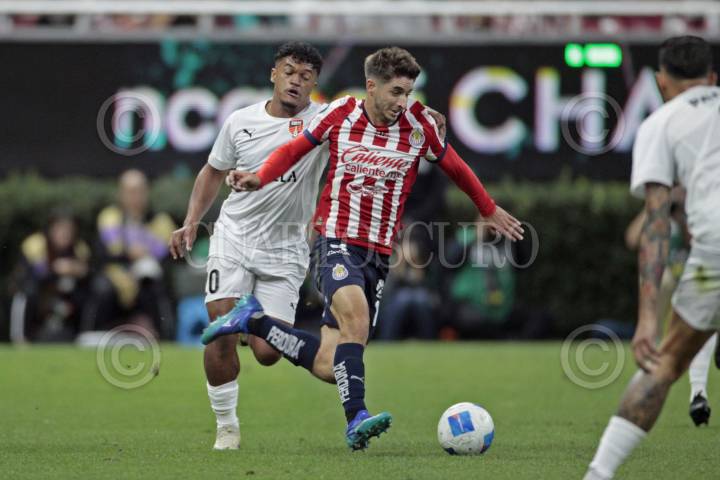 ZAPOPAN, JALISCO, 12FEBRERO2025.- Isaac Brizuela jugador de Chivas disputa el balón con el contrario de Cibao, José de la Cruz, esto en partido correspondiente los 16avos de Final de vuelta de la Concachampions, en donde se enfrentan los equipos de Chivas (México) vs Cibao (Republica Dominicana) y en juego que se lleva a cabo en el Estadio Akron, el marcador al momento es 2-0 a favor del equipo de casa. FOTO: FERNANDO CARRANZA GARCIA / CUARTOSCURO.COM
