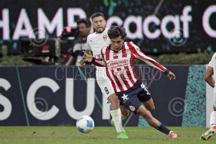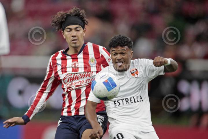 ZAPOPAN, JALISCO, 12FEBRERO2025.- Cade Cowell jugador de Chivas disputa el balón con el contrario de Cibao, Gonzalo Alarcón, esto en partido correspondiente los 16avos de Final de vuelta de la Concachampions, en donde se enfrentan los equipos de Chivas (México) vs Cibao (Republica Dominicana) y en juego que se lleva a cabo en el Estadio Akron, el marcador al momento es 2-0 a favor del equipo de casa. FOTO: FERNANDO CARRANZA GARCIA / CUARTOSCURO.COM