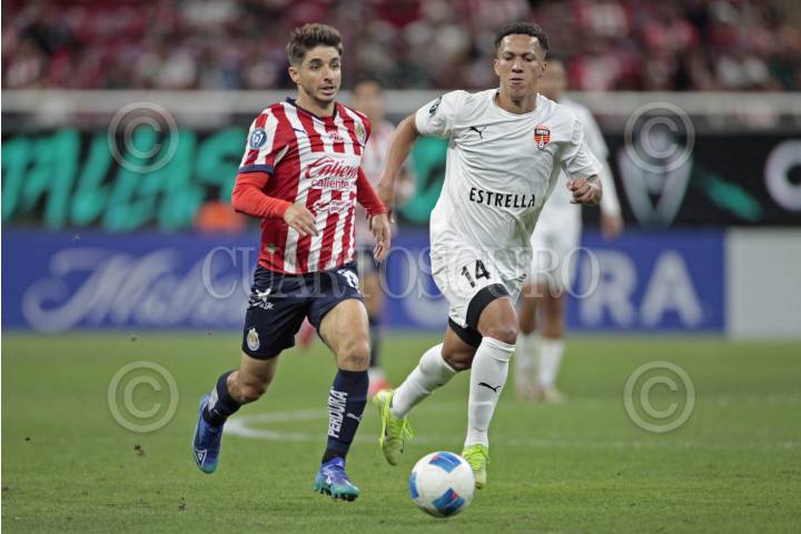 ZAPOPAN, JALISCO, 12FEBRERO2025.- Fernando Beltrán jugador de Chivas disputa el balón con el contrario de Cibao, José de la Cruz, esto en partido correspondiente los 16avos de Final de vuelta de la Concachampions, en donde se enfrentan los equipos de Chivas (México) vs Cibao (Republica Dominicana) y en juego que se lleva a cabo en el Estadio Akron, el marcador al momento es 2-0 a favor del equipo de casa. FOTO: FERNANDO CARRANZA GARCIA / CUARTOSCURO.COM