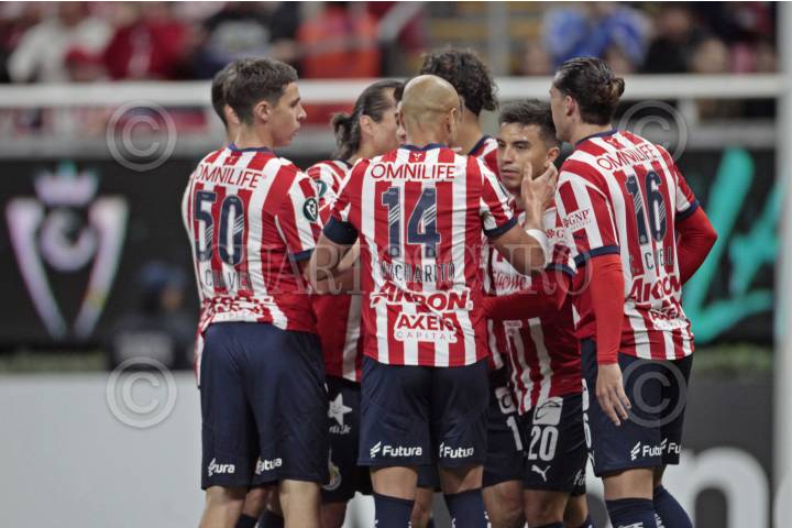 ZAPOPAN, JALISCO, 12FEBRERO2025.- Fernando Beltrán jugador de Chivas celebra su anotación con sus compañeros, esto en partido correspondiente los 16avos de Final de vuelta de la Concachampions, en donde se enfrentan los equipos de Chivas (México) vs Cibao (Republica Dominicana) y en juego que se lleva a cabo en el Estadio Akron, el marcador al momento es 2-0 a favor del equipo de casa. FOTO: FERNANDO CARRANZA GARCIA / CUARTOSCURO.COM