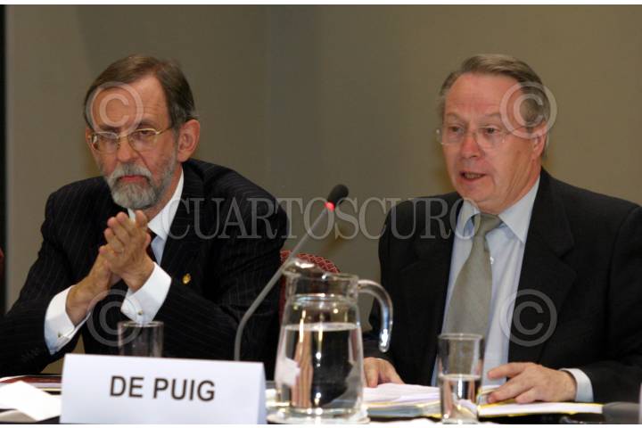 MEXICO, D.F. 17ENERO2005.- El Dr. Francisco Bolivar Zapata, investigador de Biotecnología de la UNAM y Lluis María de Puig, presidente de la PACE durante la reunión de la Comisión de Cultura, Ciencia y Educación de la asamblea parlamentaria del Consejo de Europa. FOTO: Moisés Pablo/CUARTOSCURO.COM