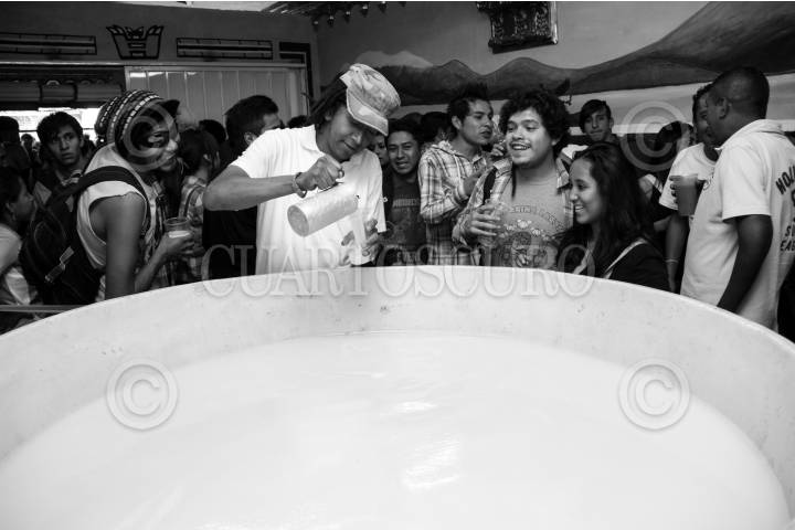 MÉXICO, D.F.,M 08DICIEMBRE2013.- El viernes por la tarde en la pulquería Las Licuadoras, ubicada en la colonia Doctores, se llevo a cabo el primer Tinacal de la Ciudad de México. Las distribuidoras de pulque: La Risa, Las Licuadoras y el Salón Casino, regalaron tinacos de esa bebida para difundir la tradición de su consumo. Cientos de personas de distintas partes de la ciudad, en su mayoria jóvenes, disfrutaron de una de las bebidas más importantes de México. El pulque es una bebida alcohólica que se fabrica a partir de la fermentación del jugo o aguamiel del agave o maguey (Agave salmiana). Actualmente su producción se realiza principalmente en el estado de Hidalgo, y casi todas las pulquerias de la ciudad traen la bebida de ese estado. FOTO: ADOLFO VLADIMIR /CUARTOSCURO.COM