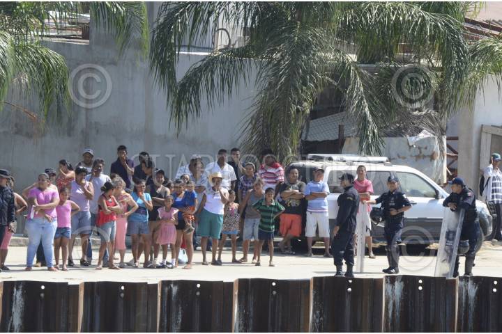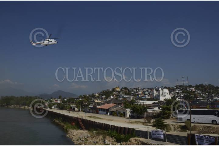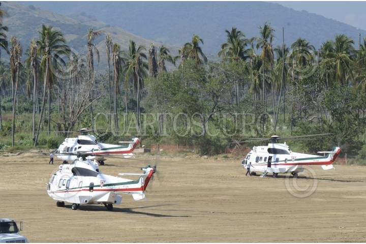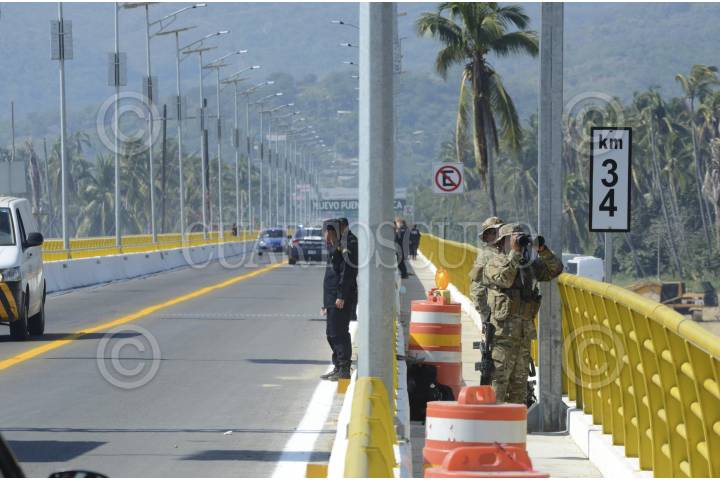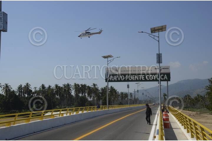 COYUCA DE BÉNITEZ, GUERRERO, 04DICIEMBRE2014.- Al presidente Enrique Peña Nieto le taparon con tela verde hasta el anuncio del Oxxo a orilla del puente del río Coyuca para que ni eso pudiera ver durante su visita a Coyuca de Benítez, donde inauguró el nuevo puente del río Coyuca, acto que se realizó en 30 minutos, en medio de un operativo de seguridad y vigilancia sin precedentes, que más que generar certidumbre sobre la situación que se vive en el estado, genera miedo, y zozobra en la población. Aunado a que la visita presidencial se mantuvo en total hermetismo a efecto de evitar protestas y movilizaciones de normalistas de Ayotzinapa durante su acto, que precisamente estaba programado para el 29 de septiembre, y se canceló por los recientes hechos ocurridos en Iguala la noche del 26 de septiembre, donde policías municipales de ese municipio y Cocula en coordinación con sicarios de Guerreros Unidos desaparecieron a 43 normalistas, mataron a tres más, y a un futbolista, al chófer del autobús de los Avispones de Chilpancingo, y a una mujer. Con Peña llegó y se fue el flamante gobernador interino, Rogelio Ortega Martínez; también asistieron los alcaldes, Ramiro Ávila Morales, anfitrión; Ediberto Tabarez, de Atoyac; Jorge Ramírez Espino, de Petatlán. Los cuatro helicópteros aterrizaron a las 12:40 horas de este jueves para dar paso al acto inaugural del nuevo puente del río Coyuca. FOTO: BERNANDINO HERNÁNDEZ /CUARTOSCURO.COM
