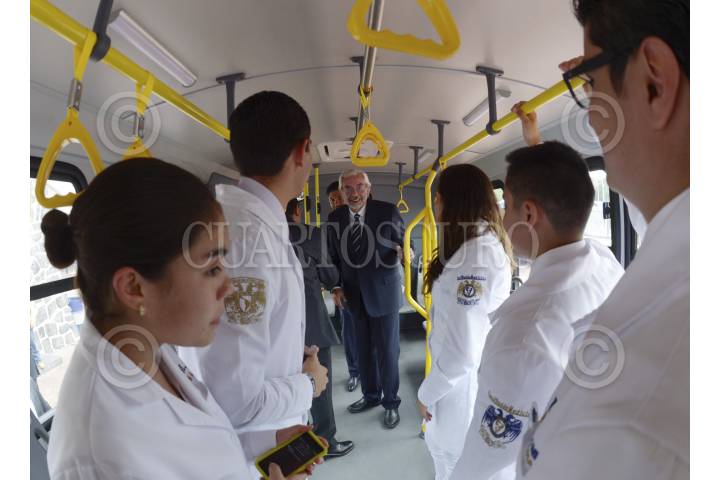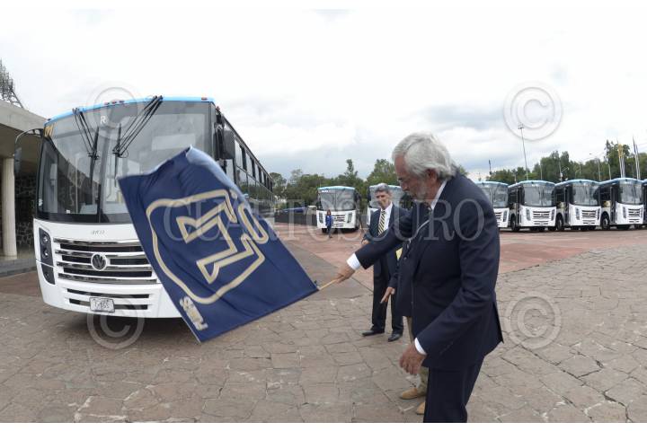 CIUDAD DE MÉXICO, 08AGOSTO2016.- El rector de la UNAM, Enrique Graue Wiechers, dio el banderazo de salida a 25 nuevas unidades del Pumabús con tecnología de vanguardia y sustentables, que fortalecen este servicio de transporte gratuito dentro del campus de Ciudad Universitaria (CU). Los autobuses de tecnología Euro V –baja en emisiones de gases contaminantes– fueron fabricados conforme a las necesidades de la comunidad: cuentan con tres puertas de ascenso y descenso, cinco salidas de emergencia y lámparas de led en el interior para dar mayor seguridad en los recorridos nocturnos. FOTO: UNAM /CUARTOSCURO.COM