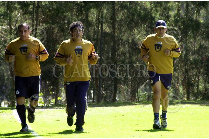 México D.F. 03 FEBRERO 2004.- El director técnico de los Pumas, Hugo Sánchez (al centro), se ejercita mientras su eqiupo entrena para el Torneo de Clausura 2004. FOTO: Sandra Perdomo/CUARTOSCURO.COM