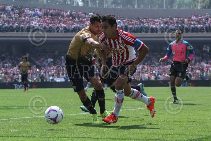 MÉXICO, D.F., 04OCTUBRE2015.- Omar Bravo jugador de las Chivas y Gerardo Alcoba de los Pumas, se disputan el balón durante el partido de la Jornada 12 del Torneo de Apertura 2015. FOTO: ISABEL MATEOS /CUARTOSCURO.COM
