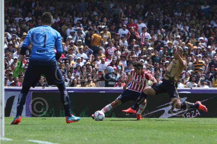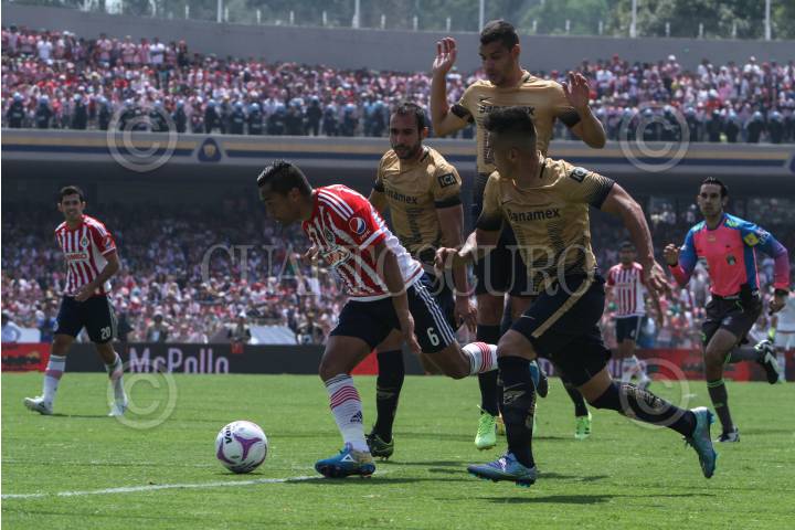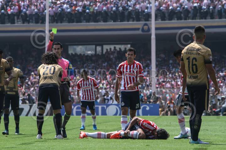 MÉXICO, D.F., 04OCTUBRE2015.- Los Pumas de la UNAM vencen a las Chivas de Guadalajara con un gol de penal cobrado por Eduardo Herrera cuando Carlos Salcido comete falta sobre Matías Britos y el árbitro marca el penal de inmediato. FOTO: ISABEL MATEOS /CUARTOSCURO.COM