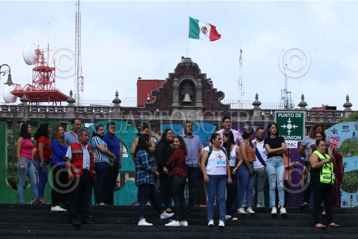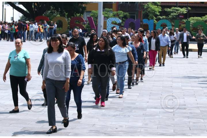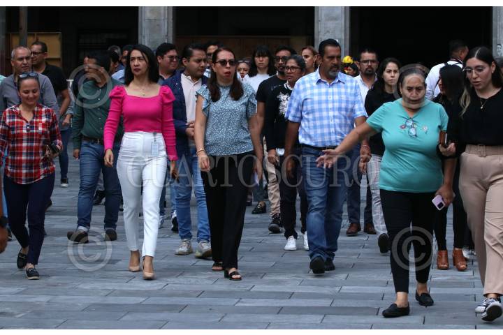 CUERNAVACA, MORELOS 19SEPTIEMBRE2023.- Burócratas del gobierno del Estado de Morelos se concentran en un punto de reunión en la Plaza de Armas durante el Simulacro Nacional 2023. Mas de 500 trabajadores del Palacio de Gobierno participaron en el ejercicio para concientizar de la peligrosidad de los sismos, evacuaron su lugar de trabajo en dos minutos y seis segundos. FOTO: MARGARITO PÉREZ RETANA / CUARTOSCURO. COM