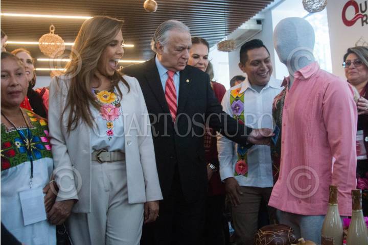 Mara Lezama, gobernadora de Quintana Roo, y Miguel Torruco, secretario de Turismo federal, durante la inauguración de la exposición y venta de artesanías del estado de Quintana Ro, exhibidas en las instalaciones de Punto México.