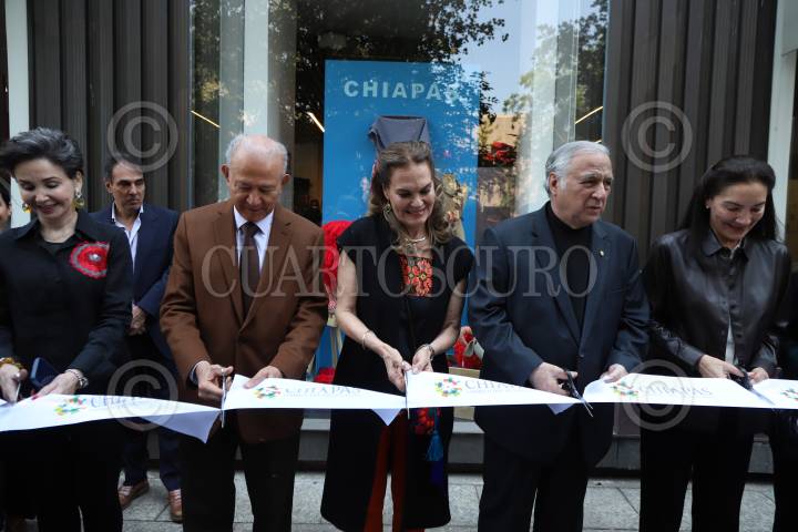 Corte del listo por parte María de Lourdes Ruíz, directora de la Casa de las Artesanías de Chiapas; Humberto Hernández, Subsecretario de Turismo Federal; Gloria Garza; el Secretario de Turismo Federal, Miguel Torruco Marqués y Katyna de la Vega Grajales secretaria de turismo del gobierno de Chiapas durante la inauguración oficial de “Punto México” entre la Secretaría de Turismo Federal y el Estado de Chiapas.
